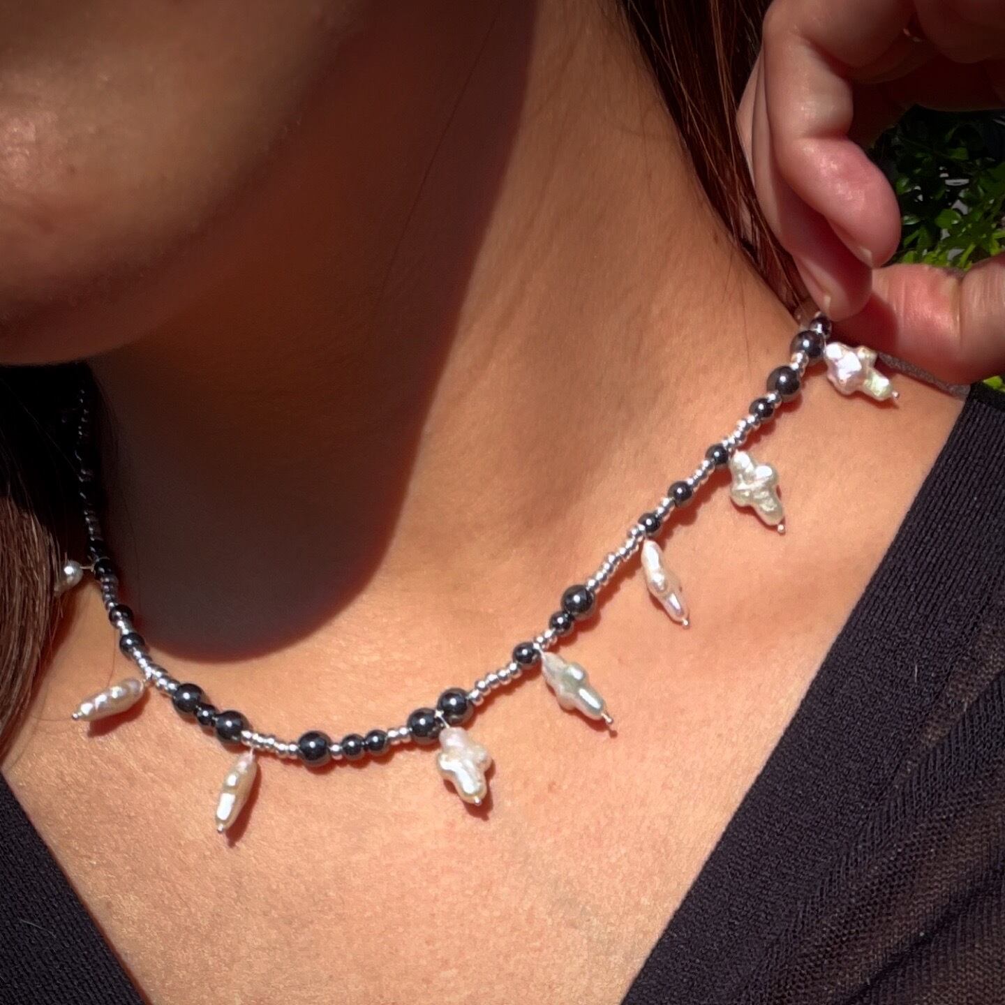 淡水パールでかたどったクロスモチーフを、シルバーとブラックのビーズで引き締めたデザイン。