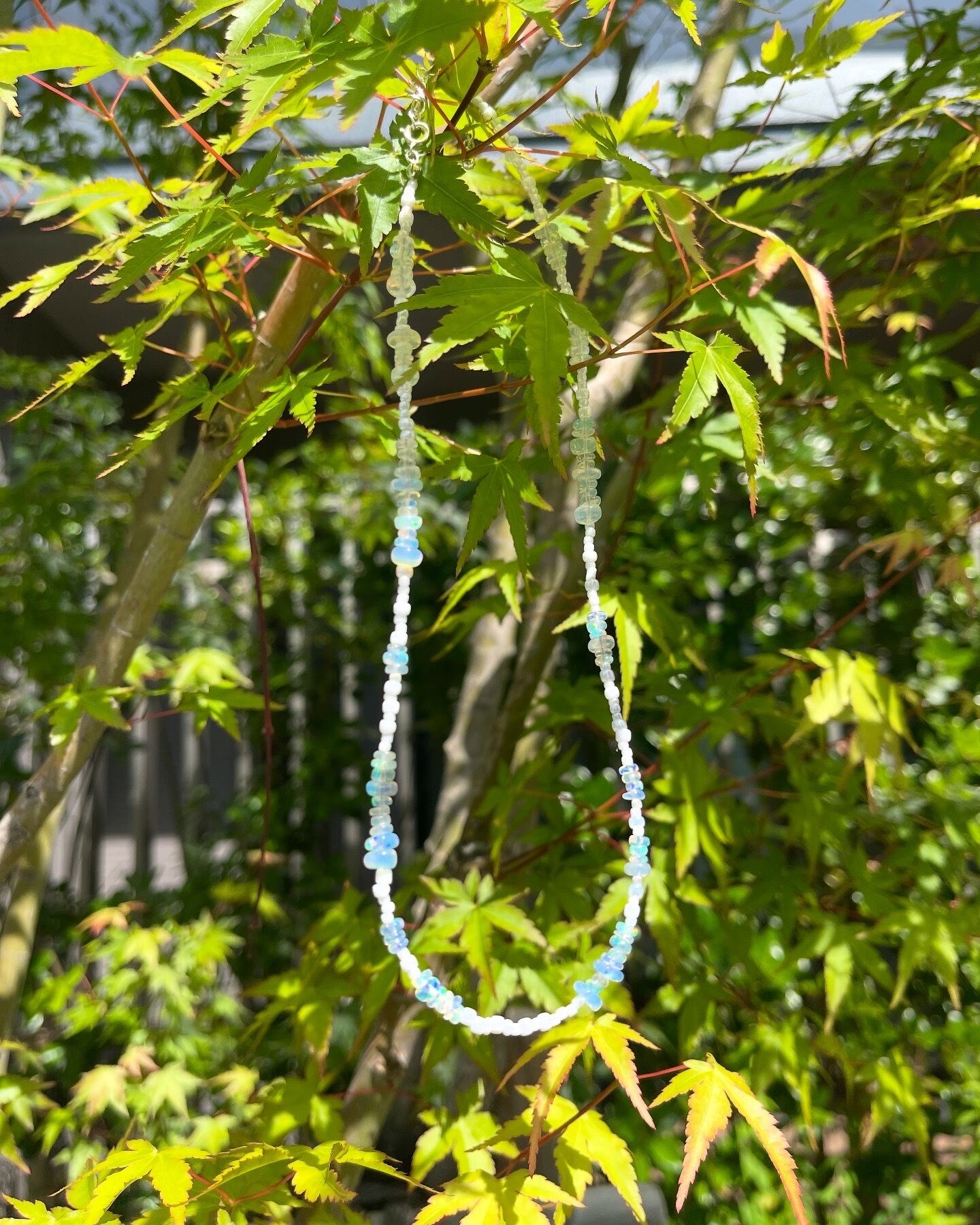 エチオピア産のオパールビーズとホワイト系ビーズを組み合わせた、軽やかで透明感のあるネックレスです。光に当たるときらきらと虹色に輝き、日常にも特別な日にもぴったりの一本。