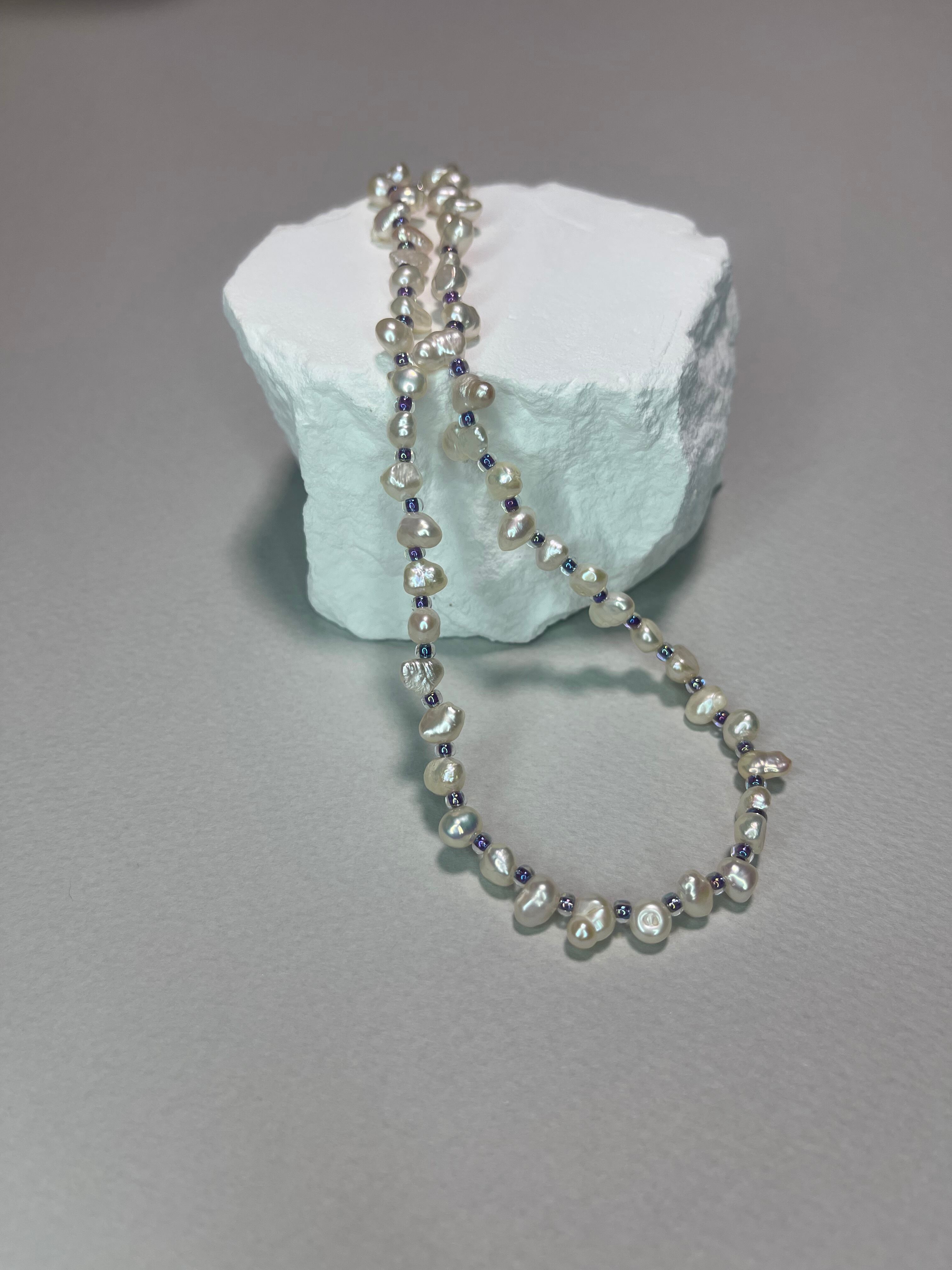 上品な光沢を放つ淡水パールを、パープル系のビーズと組み合わせたネックレスです。